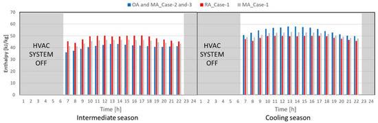 The reason that the enthalpy of the outdoor air and the enthalpy of mixed air of Cases 2 and 3 are similar on the representative day of both intermediate and cooling seasons is that the economizer system performs free cooling because the outdoor air temperature is lower than the cooling set temperature of 26 °C. In addition, the reason the enthalpy of the mixed air in Case 1 is higher than that in the other two cases in the intermediate season is that Case 1 introduces only the minimum outdoor air when cooling is needed. Because the enthalpy of the outside air is relatively lower than that of the return air, the enthalpy of the mixed air in Case 1 is higher than that of the other two cases where 100% outdoor air is introduced.