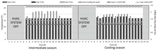On the representative day of the cooling season, Case 3 shows that the AHU-DAT is controlled at a lower temperature compared to the intermediate season, as a result of the higher cooling load. Due to the lower temperature provided to the zone, the supply air flow rate is decreased. In addition, the fan mass flow rate of Cases 1 and 2 is increased or decreased according to the cooling load pattern. This is because the outside air temperature in the cooling season is relatively high compared to the intermediate season, which is why the cooling load cannot be handled with only the minimum fan mass flow rate.
