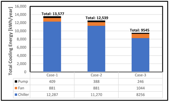 Figure 11 shows the amount of electric energy used for cooling in the intermediate and cooling seasons. The total amount of electric energy for cooling in Figure 9 is under the assumption that a chiller with a coefficient of performance (COP) of 5 is used. Case 2 consumes 12,539 kWh/year for cooling. Compared with Case 1, installation of the economizer system can save 7.6% of electricity energy. The amount of electric energy in the cooling season is increased due to the installation of the economizer system, but the free-cooling effect of the economizer system reduces the electric energy in the intermediate season. For this reason, the total electric energy consumption for cooling is reduced. Case 3 consumes 9545 kWh/year of electricity for cooling is used during a year. Compared with Case 1, electric energy of 29.7% can be saved, and compared with Case 2, 23.9% of electric energy can be saved.