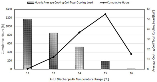 Figure 12 shows the cumulative time and hourly average cooling coil total cooling load per hour for each range of AHU-DAT in Case 3. For the analysis of the AHU-DAT in Case 3, the data were divided into five ranges. In Case 3, the AHU-DAT changes according to the cooling coil’s total cooling load. The cumulative time when the AHU-DAT is controlled by 15 °C is the maximum, and the cumulative time decreases in the order of 14, 16, 13, and 12 °C. Since AHU-DAT of Case 3 is usually controlled higher than the other two cases whereas AHU-DAT is fixed at 12 °C, the cooling load of the cooling coil is reduced, therefore reducing cooling energy consumption.