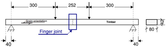 A schematic showing the four-point bending test of a spruce timber beam with finger joint from Khelifa et al. [22] (not to scale; dimensions in millimetres).