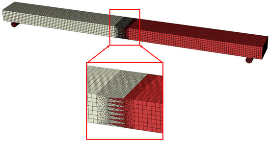 The 3D FE model for the finger-jointed timber beam consists of three parts: a left beam, a right beam, and supporting steel bars. The left and right beam parts were modelled with the anisotropic elastic–plastic constitutive law presented in the previous section. The left and right beams were connected at the finger joint using cohesive contact behaviour, as presented in Section 2.1. The majority of the beam was meshed using hexahedral elements (C3D8R), as presented in Figure 3. At the finger-joint region, an adaptive meshing technique with tetrahedral elements (C4D4) was used to achieve the good quality meshing of complex finger-joint geometry, as shown in Figure 3. A mesh convergence study was performed to examine the effect of mesh size on the numerical results. The steel bars with a diameter of 20 mm and a length of 42 mm were modelled with C3D8R elements (mesh size of 2 mm). The steel bars were assumed to behave elastically (E = 200 GPa and v = 0.29) in the numerical simulation.