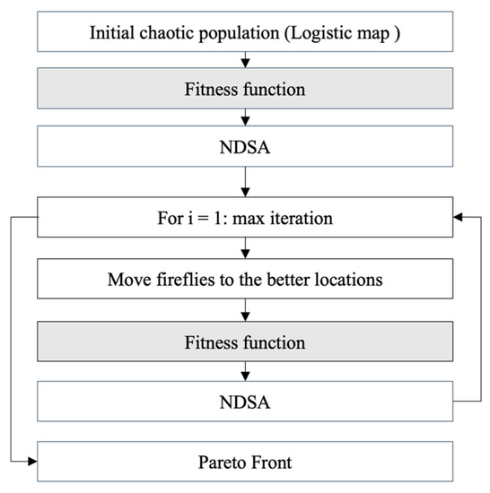 Figure 6 depicts an entire flowchart showing the MMOFA. It is worth mentioning that the fitness function can be found in Figure 5. The number of samples and the maximum number of iterations in this study were 30 and 50, respectively.