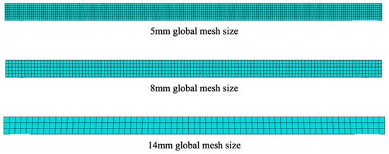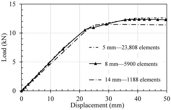 In order to validate and assure the accuracy of the developed FE model, the numerical results were compared with the experimental results reported by Khelifa et al. [22]. First, the behaviour of the control beam (i.e., no finger joint) was used in the validation process. The experimental setup for the control beam was identical to that for the finger-jointed beam presented in Figure 1. Three mesh sizes (14, 8, and 5 mm) were investigated for mesh convergence, as shown in Figure 7. Figure 8 presents the effect of mesh size on the load-displacement results for the control beam. It can be seen that with the mesh size of 14 mm (1188 C3D8R elements), the mesh is coarse, as shown in Figure 7, and the numerical result has not converged yet. The models with mesh sizes of 8 mm (5900 elements) and 5 mm (23,808 elements) produce very similar results. As a result, the mesh size of 8 mm was used in the following numerical results.