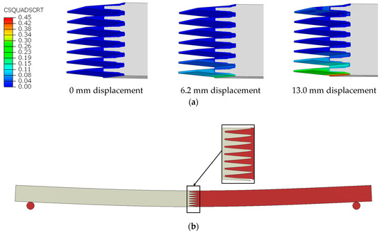 (a) The failure of the glue lines at the finger-joint using the CSQUADSCR index, (b) The deformed shape of the beam at the failure point with the opening of the finger joint.
