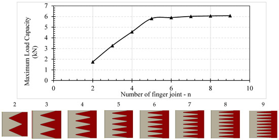 Using the validated FE model, a series of parametric modelling was conducted to investigate the effect of a finger joint, including the finger length (), tip thickness (), and number () of fingers, on the flexural behaviour of a finger-jointed timber beam. From this comprehensive parametric study, it is concluded that the number of fingers () and finger length () significantly influence the maximum load capacity, whilst the tip thickness () has a marginal effect on the performance. Furthermore, the results indicate that there exists a design threshold for the number of fingers and finger length to achieve an efficient, high-performance design of finger joints ( and in this study).
