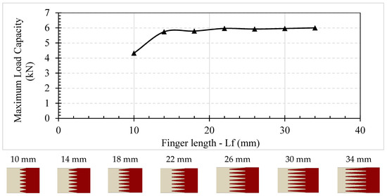 Similarly, Figure 13 presents the effect of the finger length (Lf) on the flexural performance of the finger-jointed timber beam. As discussed in Section 3, the finger length varies 10 mm to 34 mm in this investigation. The number of fingers and tip thickness were kept constant at seven fingers and 1 mm, respectively. The result shows that the vertical bending strength of timber samples generally increases with the increase in the finger length. Figure 13 shows that the performance increases significantly as the finger length increases from 10 mm to 14 mm. Then, the increasing trend becomes flattened. According to the experiments conducted by Hu et al. [42], for the finger length of 13, 20, 25, and 35 mm, the influence of finger length (13–35 mm) on the flexural performance of finger-jointed beam is minimal. The experimental observation in Hu et al. [42] is confirmed with the numerical results presented in Figure 13. The results show that the performance of 14–34 mm finger length is very similar. Nonetheless, the present numerical result also shows that there is a dramatic drop in the performance (approximately 25%) when the finger length decreases from 14 mm to 10 mm. It is worth mentioning that the finger length less than 13 mm was not tested in the study of Hu et al. [42]. The result from Figure 13 also aligns with the common practice in the Canadian EWP industry, where the finger length typically ranges from 22 to 29 mm [43].