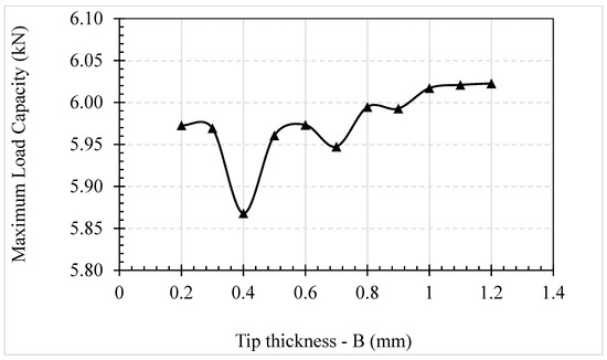 Figure 14 shows the normalised performance of the finger-jointed timber beam with respect to the variation in tip thickness ( from 0.2 mm to 1.2 mm) while the number of finger joints and finger length were kept constant at seven finger joints and 22 mm, respectively. In general, there are two clear patterns in the relationship between the tip thickness and the flexural performance of finger-jointed timber beams. From 0.2 mm to 0.7 mm, the relationship is fluctuating, whereas the performance increases when the tip thickness increases from 0.7 mm to 1.2 mm. Nonetheless, it is worth mentioning that the impact of the tip thickness (Figure 14) on the flexural performance of a finger-jointed timber is marginal, compared to that of the number of finger joint (Figure 12) and finger length (Figure 14). The difference between the best and worst performance is only 0.15 kN, as presented in Figure 14.