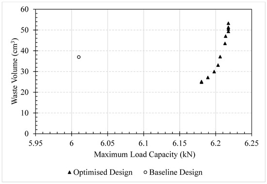 The two objectives of this study are mutually contradictory. Therefore, the MOMFA was used for the multi-objective design. There are two main methods for multi-objective design: the first is to combine all the separate objective functions into a single function using weighting criteria, and the second is to identify the entire Pareto optimum solution set. The second approach was used in this study. If a solution is dominant among other solutions in the solution space, it is said to be Pareto optimum. The performance of each solution is assessed primarily using the placement of its location closer to a preferred region with a higher maximum load capacity and a lower waste volume—the closer the solution is to the bottom right of Figure 15, the better performance. A convergence study was conducted to ensure the result from the MOMFA converged, and it can be observed that 50 iterations are sufficient for this study.