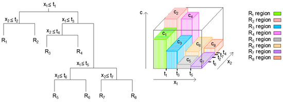 According to the implemented binary recursive segmentation (Figure 3 (left)), each step involves splitting the input space into two parts and repeating the segmentation process. The resulting areas or regions should not overlap and encompass the whole space of predictors or input variables. In binary recursive partitioning, the output is characterized by the mean value in each of the two areas that make up the input space.