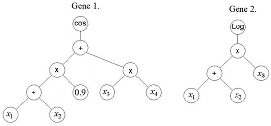 With the MGGP method [29,30,31,32], individuals are first created, making up the initial population (Figure 4). Then, each individual model is represented by one or more trees. The tree model is formed in the first iteration as a random selection of mathematical functions, constants, and model variables. Each tree represents one gene. Trees end with terminal nodes that are either model input variables or constants, while all other nodes are called functional nodes.