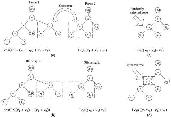 Crossover and mutation operation in MGGP: (a) random selection of parent tree nodes; (b) exchange of parents’ genetic material; (c) random node selection in tree mutation; and (d) mutation of a randomly selected part of a tree [20].