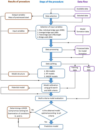 Accurate prediction of the prestressed steel amount is essential for a concrete-road bridge’s successful design, construction, and long-term performance. Predicting the amount of steel required can help optimize the design and construction process, and also help project managers and engineers estimate the overall cost of the project more accurately. The prediction model was developed using data from 74 constructed bridges along Serbia’s Corridor X. The study examined operationally applicable models that do not require indepth modeling expertise to be used in practice. Neural networks (NN) models based on regression trees (RT) and genetic programming (GP) models were analyzed. In this work, for the first time, the method of multicriteria compromise ranking was applied to find the optimal model for the prediction of prestressed steel in prestressed concrete bridges. The optival model based on GP was determined using the VIKOR method of multicriteria optimization; the accuracy of which is expressed through the MAPE criterion is 9.16%. A significant average share of 46.11% of the costs related to steelworks, in relation to the total costs, indicates that the model developed in the paper can also be used for the implicit estimation of construction costs.