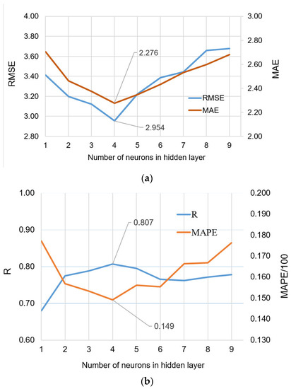 In this paper, the upper limit of the number of neurons was adopted, and then different architectures of neural networks were examined, starting with one neuron in the hidden layer and finally with the number of neurons equal to the upper limit obtained by the expression in row 6 in Table 1.