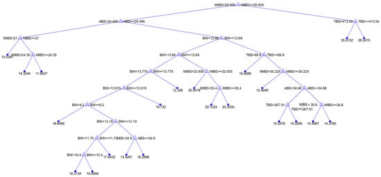 Regression trees (RTs) are a straightforward and understandable machine-learning model that may be used for regression and classification [20]. In each tree node, except for the leaves, the corresponding condition is examined. Whether the condition is met or not, one or the other branch of the tree goes to the next node. An example of a decision tree is given in Figure 3. For the corresponding input quantity, that is, the instance (a vector or matrix) of the problem under consideration and for which a prediction needs to be made, the corresponding condition at the root of the tree is first examined. Then, depending on the result, the instance follows the branch that corresponds to that result to the next node and repeats the process until it reaches the terminal leaf, whose value indicates the requested prediction. All instances of space initially belong to the same set, and then space is gradually split up into subsets.