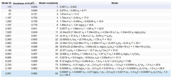 Original output from the GPTIPS 2.0 software with analytical expressions of the models that make up the Pareto front (models with 4 genes and a maximum depth of generated trees of up to 4).