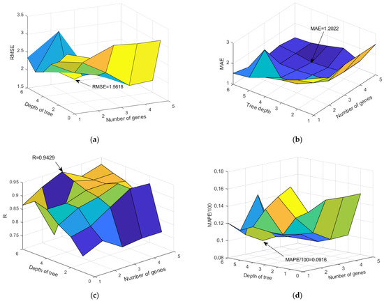 Comparison of accuracy criteria for the MGGP model as a function of gene number and tree depth (a) RMSE, (b) MAE, (c) R, and (d) MAPE.