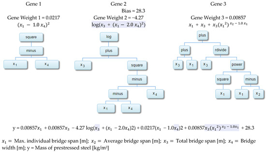 The application of defined symbolic models in the form of constitutive equations is quick. The structure of the model and its parameters are extracted directly from the data in this study, as opposed to the standard regression models, which first specify the model’s structure before determining its parameters from the experimental data. The resulting model, which takes the form of scaled trees and represents a linear combination of nonlinear input transformations, can effectively simulate the challenging task of estimating the consumption of prestressed steel during the construction of prestressed concrete bridges.