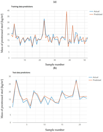 Graphic representation of modeled (model gene = 4, depth = 4) and actual values of prestressed steel consumption: (a) training set and (b) testing set.