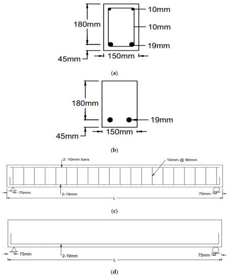 d) of all the beams was kept at 180 mm. The clear concrete cover to the bottom reinforcement was 35.5 mm and 25.5 mm, respectively, for the beams without stirrups and with stirrups. The longitudinal reinforcement comprising two deformed steel bars of 19 mm diameter was provided in all eight beams. The longitudinal reinforcement ratio of all beams was 2.1%, and beams were transition reinforced to ensure that beams failed in shear. The longitudinal reinforcing bars at the ends were bent at 90