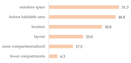 Having experienced confinement, almost 59% claimed to better appreciate some domestic spaces or attributes: exterior space (49%), living room (17%), home office (8.5%), bedroom (4.3%); solar intake, privacy, and multifunctionality was also mentioned as desirable traits. As for what households will most likely value in a future dwelling (Figure 1), the priority goes to a private exterior space (51.25%), followed by an indoor habitable area (48.75%), location (38.75%), and layout (25%). Albeit less relevant for the surveyed households, the number of compartments of a future dwelling was also selected and numerous compartments (17.5%) were considered to be preferred over a less compartmentalized interior (6.25%).