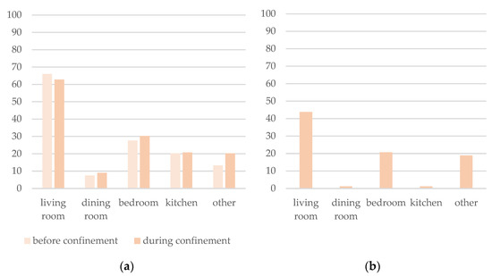 The living room is the space mostly used by the majority of household members (both before and during confinement). Nonetheless, results show that there was a decrease in the use of this space during confinement and an increase in the use of all other domestic spaces—dining room, bedroom, kitchen, and other rooms (more than half of the answers ‘other spaces’ referred to an office space or study area) (Figure 5a). Albeit this reduction in usage time, the living room is the place where most respondents worked or studied during confinement. Other domestic settings that started to incorporate this new activity were the bedroom, ‘other’ spaces (mostly home office), dining room, and kitchen.