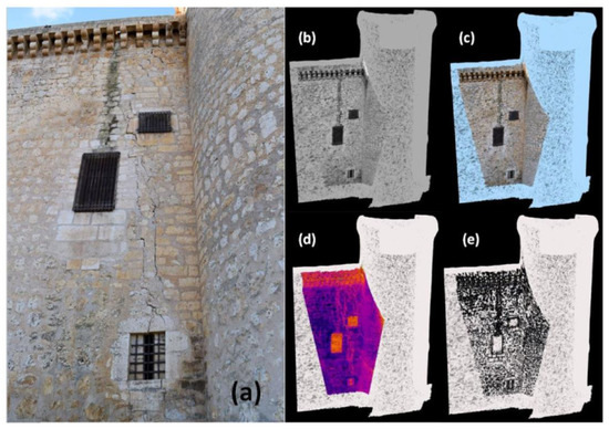 Integration of different information: (a) north-east wall of the Castle of Torrelobatón, Spain; (b) reflectance info; (c) color info; (d) thermal info; (e) multispectral info (from [11]).