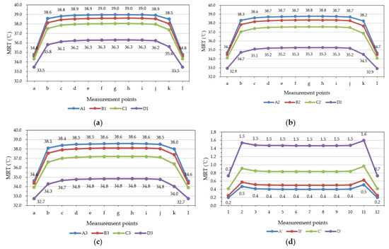 Spatial distribution of Mean Radiant Temperature (MRT) values in pedestrian spaces: (a) MRT values at a height of 0.5 m; (b) MRT values at 1 m; (c) MRT values at 1.5 m; (d) MRT differences between points at heights of 0.5 and 1.5 m (from [20]).