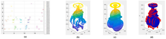 Detection and verification of irregularly shaped components: (a) clustering results for potential positions of valves; (b) retrieved point cloud of a valve; (c) as-designed point cloud of the valve; (d) registration of as-built and as-designed point clouds with TrICP (adapted from [25]).