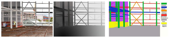 A photo taken from the construction site (left); photo’s depth map (center); output of semantic segmentation for identifying structural building parts (right) (adapted from [40]).