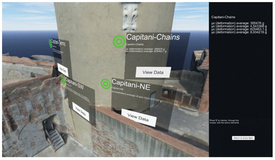 The virtual reality environment: users can explore the virtual reconstruction of a monitored structure while having direct access to the values measured by the sensors network (from [51]).