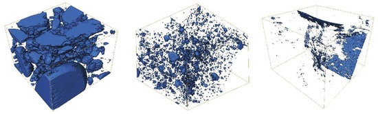 When one deals with microstructural cracks (for instance, to analyze the onset of corrosion phenomena), the image processing process becomes more expensive, since voids and cracks grow in the same greyscales. Deep convolutional neural networks were used in [57] to approach this issue, adopting X-ray computed tomography and then reconstructing the three-dimensional distribution of mortar, aggregates, voids, and cracks (see Figure 7). This detailed approach is an important tool to better understand how a damage mechanism evolves at a small scale in concrete elements.