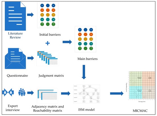 The purpose of this study was to determine the main barriers to the promotion of prefabricated buildings, and explore the correlation between these factors, so as to deeply understand the promotion path of prefabricated buildings. In order to achieve the research objectives, this study used a literature review, AHP and ISM to identify and analyze the barriers to the promotion of prefabricated buildings. Firstly, the list of barriers to the promotion of prefabricated buildings was determined through a literature review. Next, the AHP method was used to determine the main barriers as the basis for the subsequent system modeling. Then, ISM was used to establish the structural model of the promotion barriers of prefabricated buildings. Finally, MICMAC was used to analyze the dependence and driving force of the main barriers to the promotion of prefabricated buildings, and the barriers were classified, so as to propose corresponding management countermeasures for different types of barriers. The research path of this paper is shown in Figure 1.