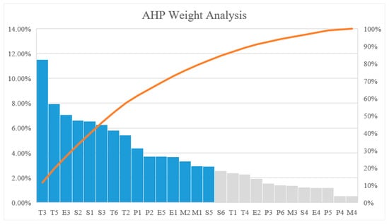 The ABC classification method considers factors whose weight rankings cumulatively reach 80% as the main factors; according to the 2/8 principle (Pareto principle), factors whose weight rankings cumulatively reach 80% are to be considered key factors [33]. At the same time, it is generally not advisable to use the ISM for excessive systematic analysis. Therefore, after comprehensive consideration, this study selected barriers whose cumulative weight rankings reached 80% as the main barriers to the promotion of prefabricated buildings. This is shown in Figure 2 and Table 5.