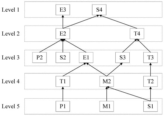 (6) Establish the hierarchical structure model. Based on the hierarchical division results, establish a reduced reachable matrix R’, and the sorted reduced reachable matrix is a lower triangular matrix. Draw each factor according to its hierarchical level, and use directed line segments to represent the relevant relationships between adjacent factors. If there is already a directed line segment representing the relationship between adjacent factors, there is no need to draw a new line segment between cross-level factors.