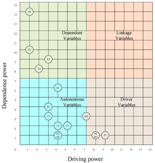 The factors in the second quadrant are driving factors, including “Imperfect industry standards and norms P1”, “Lack of professional talent S1”, “Lack of enterprise management experience M1” and “Immature management mode M2”. The driving factors have a high driving power and low dependence power, among which, P1 had the highest driving power, indicating its stronger ability to influence other factors. These factors are deep-seated factors of the model, which are the fundamental and critical factors leading to the slow promotion of prefabricated buildings. Controlling these factors can effectively reduce the probability of other factors occurring. It can be seen that these factors were basically located at the bottom or second to last level of the model and need to be addressed with emphasis. These four factors are key barriers in the process of promoting prefabricated buildings.