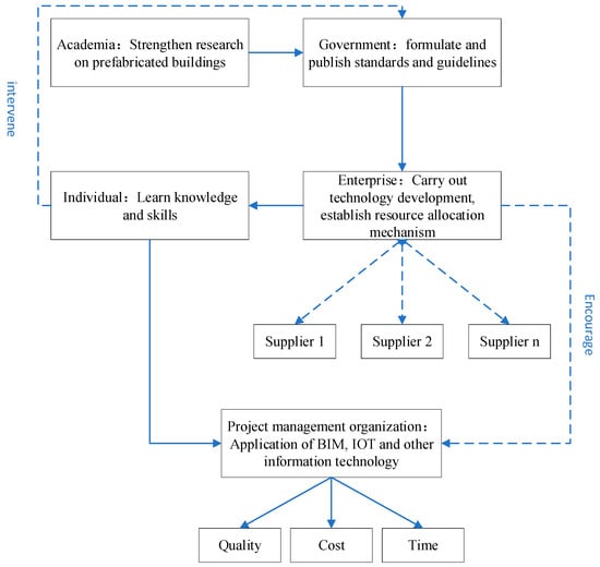 At the organizational level, intermediate barriers to the promotion of prefabricated buildings should be addressed. On the one hand, companies need to establish long-term cooperative relationships with various enterprises in the supply chain to ensure the integrity of the industrial chain. At the same time, a reasonable resource allocation mechanism should be established to ensure sufficient prefabricated components for multi-project construction. On the other hand, companies should carry out technological development to overcome key technical problems and minimize production input. Considering that the barriers at the intermediate level are related to those at the top and bottom levels, overcoming these barriers will help to solve top-level barriers if successful.
