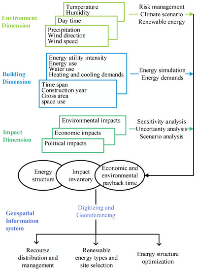 However, only a few studies assessed and simulated multi-level energy demands, identified potential renewable energy, reduced energy use, and estimated/improved energy efficiency with geospatial information. The integration of building information and energy design and the assessment with geospatial information systems involve many aspects and challenges, such as data availability, scalability, and integrability, and a lack of clear and applicable frameworks. In real practice, urban planners and energy structure decision-makers are facing challenges when applying sustainable strategies without the support of mapping beyond single buildings, and the difficulties will increase at a distance.