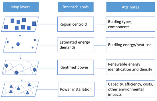 Figure 2 presents the geographical objects and the attributes used for the application of renewable energy in buildings in the GIS environment. The possible building density in an area is related to regional objects which can be observed using national census data on lands. Spatial aggregation and querying tools in the GIS environment will be applied to evaluate and present the energy demands in buildings. The identified energy production systems are initially located at the centroids of the regional objects, and their mechanical features are defined. The collecting renewable energy area for each single building is considerws the maximum acceptable energy transportation distance. The cost of electricity production for every identified power can be then assessed and evaluated using a road and grid network [29,30]