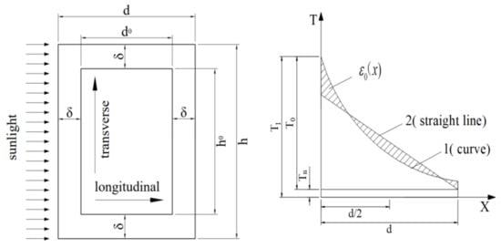 At present, the research on the influence of sunlight temperature differences on the alignment of bridge piers usually begins from the one-dimensional problem. First, the temperature field effects in the one-dimensional direction of the structural plane are analyzed, as shown in Figure 1, and then the temperature field effects in another dimension are analyzed. The total offset value is then obtained using a coupling calculation, and this analysis method has achieved the expected results in several practical engineering projects [31,32]. Referring to the relevant literature and specifications [37], under the action of a sunlight temperature difference between the AB-side and the CD-side, as shown in Figure 1, the temperature gradient pattern of box piers along the wall thickness is distributed exponentially [38] as follows: