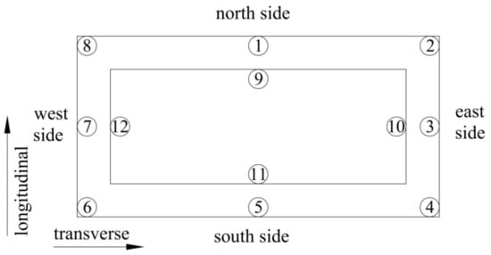 Figure 3 shows the layout of the measuring points at the vertical 1/4 section of the No. 5 pier, and the vertical 1/2 and 3/4 section measuring points were arranged in the same manner. The middle measuring point on the north side was the starting point, and clockwise from the outside to the inside, these were numbered 13 to 24 and 25 to 36, respectively. When installed, embedded thermometer is close to the inner or outer side of the pier, each thermometer was first fixed on the steel bar of the pier body, and then buried in the concrete after moisture and mechanical damage prevention steps were taken. In addition, a signal cable of embedded thermometer needed to be drawn out of the concrete’s surface.
