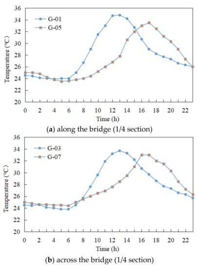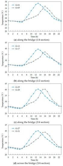 Figure 8 shows that the temperature changes at the measuring points at similar positions of each section of the pier along both the bridge direction and the transverse bridge direction (both on the positive and negative side) were roughly the similar. In the morning, the temperature of the measuring point on the positive side of the 3/4 section rose rapidly and reached its highest temperature of 40.5 °C (north side) and 41 °C (east side) at 12:00 and 13:00, respectively. In the afternoon, the two sides came under shade, and the temperature of the measuring point cooled until 0:00 at night. The temperature of the 3/4 section of the pier was higher than the other sections as well, at up to 41 °C, but this was mainly due to the fact that July had much hotter weather than June or May as well as an earlier sunrise and higher sunlight intensity. Moreover, the higher the height of the pier section, the longer the sunlight radiation time. At about 12:00, the temperature difference between the two sides of the pier in both the longitudinal and transverse directions reached their maxima, which were 8.5 °C and 7 °C, respectively.