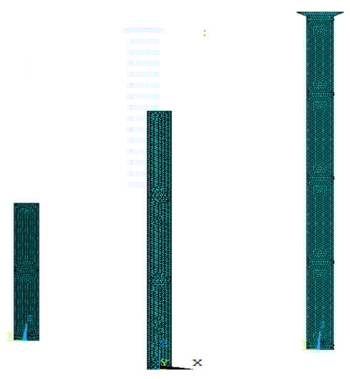 First, the finite element analysis models of bridge piers under three working conditions were established by ANSYS finite element analysis software: finite element models of vertical 1/2 section height, vertical 3/4 section height, and bridge pier construction completion. The temperature field unit of the ANSYS finite element model was the SOLID87 three-dimensional solid thermal analysis unit, and the structural field unit was the SOLID187 three-dimensional solid structural analysis unit. When the thermal coupling analysis of the temperature field was carried out, the temperature load could only be applied to the thermal analysis unit SOLID87. After thermal analysis, conversion between the thermal unit SOLID87 and the structural unit SOLID187 was achieved through ANSYS interface operations and command streams in order to apply the structural stress load generated by thermal analysis and then complete the thermal coupling analysis of the structural temperature field. The three ANSYS finite element models of the No. 5 pier are shown in Figure 10.