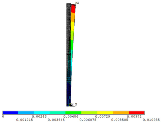 The displacement calculation under the action of a temperature field was carried out by ANSYS, and the displacement of the pier top of the No. 5 pier three sunlight temperature difference conditions was 2.157 mm (Condition 1), 5.801 mm (Condition 2), and 10.935 mm (Condition 3). As shown in Figure 11, Figure 12 and Figure 13.