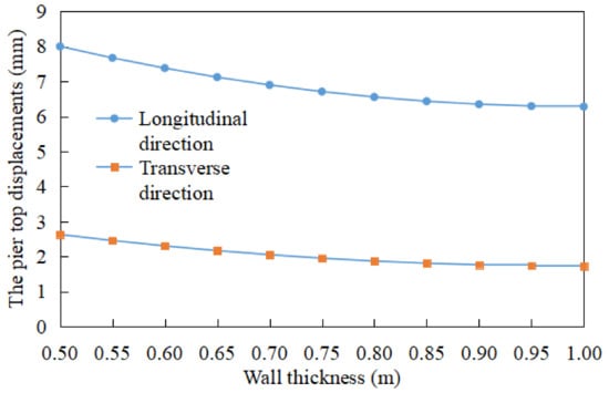 Figure 16 shows the displacements of the pier top when the wall thickness of the pier changes. If the wall thickness is too small, it affects structural safety, so the minimum wall thickness was set to be 0.5 m. Assuming the temperature difference of the pier to be 5 °C and that the pier only consisted of one segment, as above, other parameters remain unchanged. It can be seen from the Figure 16 that the offset of the pier top decreases with an increase in pier wall thickness, but when the wall thickness reaches 0.75 m, the offset of the pier top does not change much with further increases. This shows that for thin-walled hollow piers, increasing wall thickness has little significance after a point in limiting the displacement of the pier top.