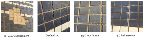 Regarding grout failure, the main defects are related to the degradation of the filling material or the loss of material in the joints. These anomalies occur due to the natural weathering processes associated with the lack of maintenance activities [11]. The defects in the joints’ filling material can allow the infiltration of water, which may compromise the overall condition of the ceramic cladding, reducing its durability and service life, a process that occurs more rapidly the more aggressive the environmental context [32].