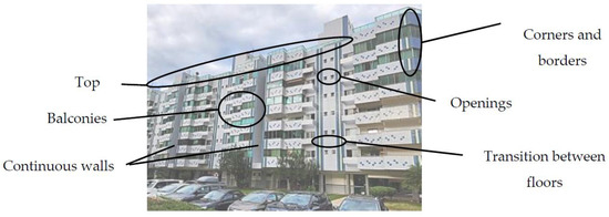 Various studies [12,13,14] address the monitoring and classification of defects in façade cladding. Most of these studies adopt statistical analysis to identify degradation patterns and trends, which can be translated into graphic schemes that identify the susceptibility to defects along the façade. These maps of risk of occurrence of defects can be used to improve design and maintenance strategies for the elimination or mitigation of the occurrence of defects [15,16].