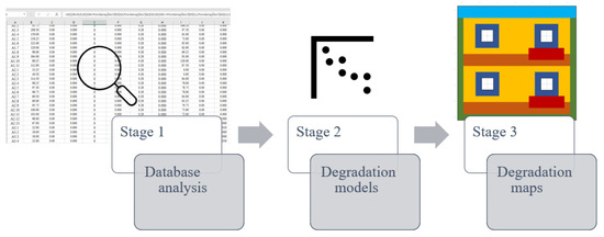 This research is divided into three stages, as illustrated in Figure 4. The first stage consists of analysing the database, which was developed by researchers from the project “Degradation, Measurement and Modelling (DMMproject)” of the graduate program in structures and civil construction at the University of Brasília, Brazil [11]. The second stage corresponds to the adaptation of the methodology proposed by Gaspar and Brito [15] to evaluate the probability and sensitivity to a specific defect of the different areas of the façades. The third stage comprises the definition of a model to represent the probability of occurrence of specific defects on ceramic claddings in the six regions of the façade considered, taking into consideration the database of 345 façades inspected in Brasília, with ages between 5 and 43 years of construction and an average value of approximately 23.5 years.