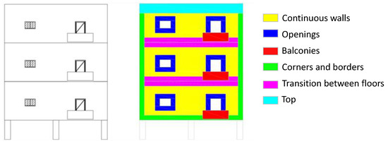Although the different defects have distinct causes, several studies suggest the recurrent occurrence of certain defects in specific areas of the façade. These studies [15,34,35,36,37] map the occurrence of anomalies, dividing the façade into regions. In this study, the façade is divided into six regions, as shown in Figure 2, namely: (i) continuous walls (CW), which represent the area of the façade without discontinuities, i.e., the façade surface area without openings for window frames or balconies; (ii) openings (OP), which correspond to the perimeter of the frames around windows and doors; (iii) balconies (BA), corresponding to the protruding area of the façade more exposed to weather degradation agents; (iv) corners and borders (CB); (v) transitions between floors (TF); (vi) top, corresponding to the area above the last level, that is, a platband, wall, or other type of protection above the roof or courtyard of a building. Such regions of the façade are defined considering previous studies and the architectural characteristics of the buildings that respect a pilot construction plan, thus presenting a homogeneous typology.