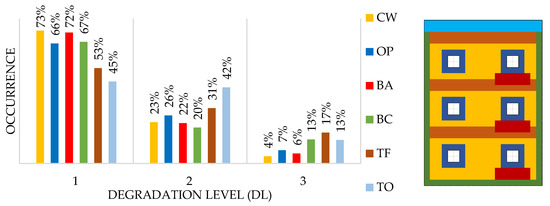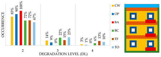 Ceramic tile detachment is the most important anomaly to be mapped, since its occurrence compromises the integrity of the coating and the safety of users and passers-by. Figure 6 presents the probability of the occurrence of detachment in the six regions considered and Figure 7 shows the standard map for the ceramic cladding sensitivity to detachment. The results reveal that the regions of transition between floors (0.694) and continuous walls (0.654) are more prone to the occurrence of detachment of ceramic claddings. When analysing the occurrence of detachment with the highest degradation level (level 4, in Figure 6), the results show a higher incidence of severe detachment in the transition between floors (TF), in the top of the building (TO), and in the borders and corners (BC).